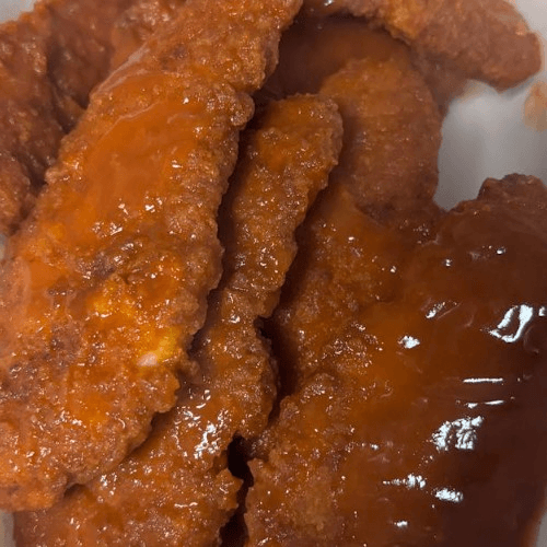 Breaded Buffalo chicken tenders, iceberg lettuce, tomatoes, cucumbers.