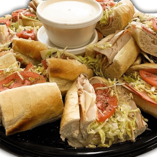 Serves 10. Hoagie tray contains 20 three-inch pieces,Choose an assortment of your hoagie favorites and 5 toppings and spreads packed in cups on the side