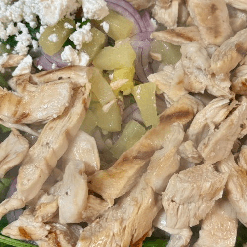 Fresh tomatoes, black olives, feta cheese & grilled chicken
