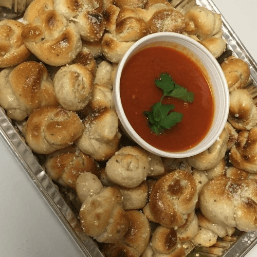 50 pc. A classic snack, strips of pizza dough tied in knots, baked, and topped with oil, garlic, Romano Cheese, and parsley. Supersized for your party